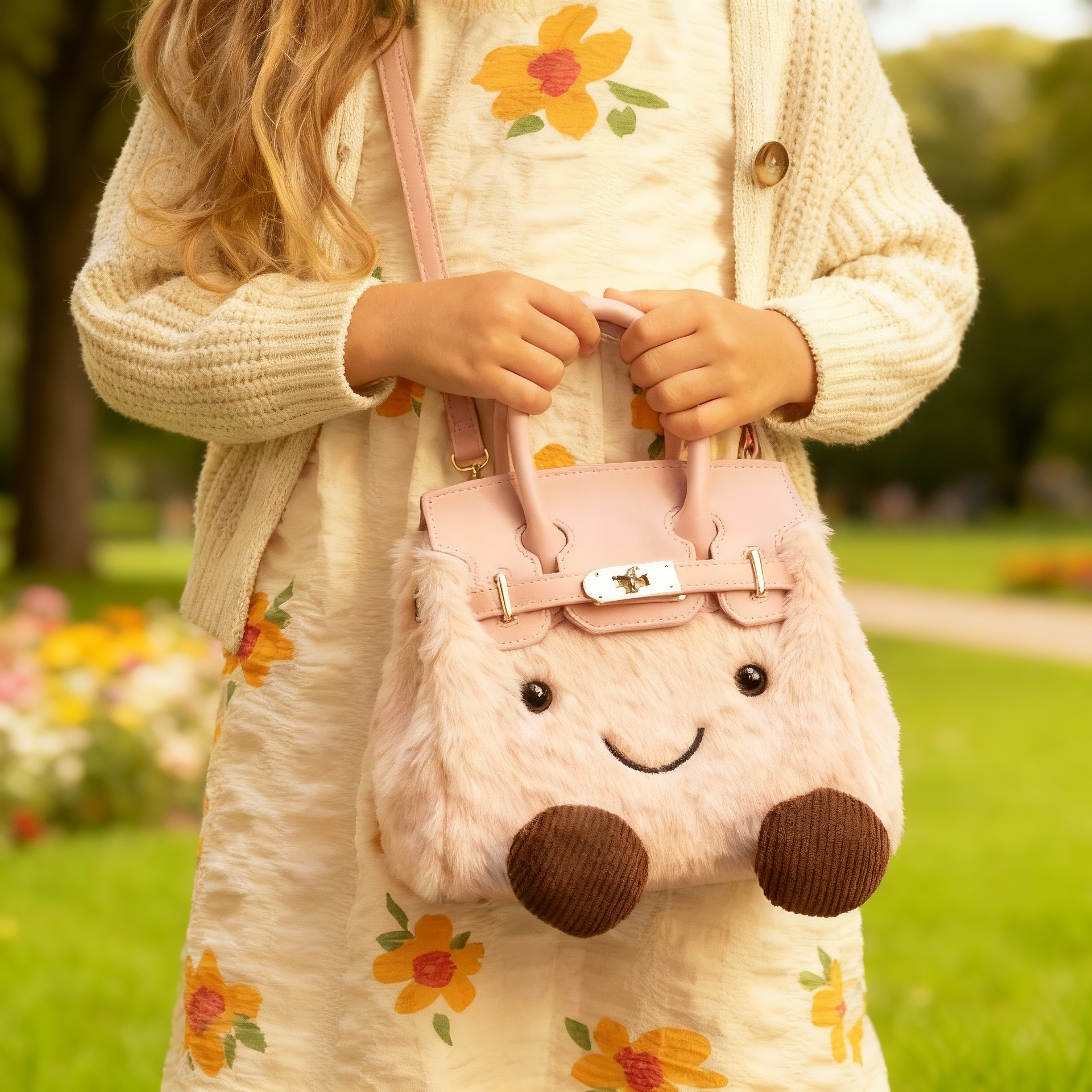 Classic is the signature, with a plush smiley face body and soft brown corduroy feet. Finished with a matching detachable strap, she can carry it by the top handle or wear it crossbody for playdates, parties and every “just like Mommy” moment.